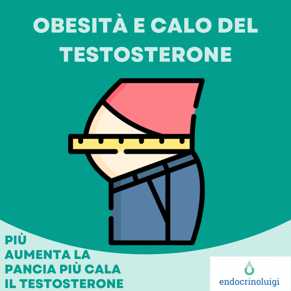 L’obesità, in particolare addominale, è un fattore di rischio per mortalità e malattie cardio-vascolari ed è stata trovata una relazione inversa tra circonferenza vita e livelli di testosterone (più aumenta la pancia e più cala il testosterone), che risulta inferiore alla norma in molti, ma non tutti, i pazienti obesi.