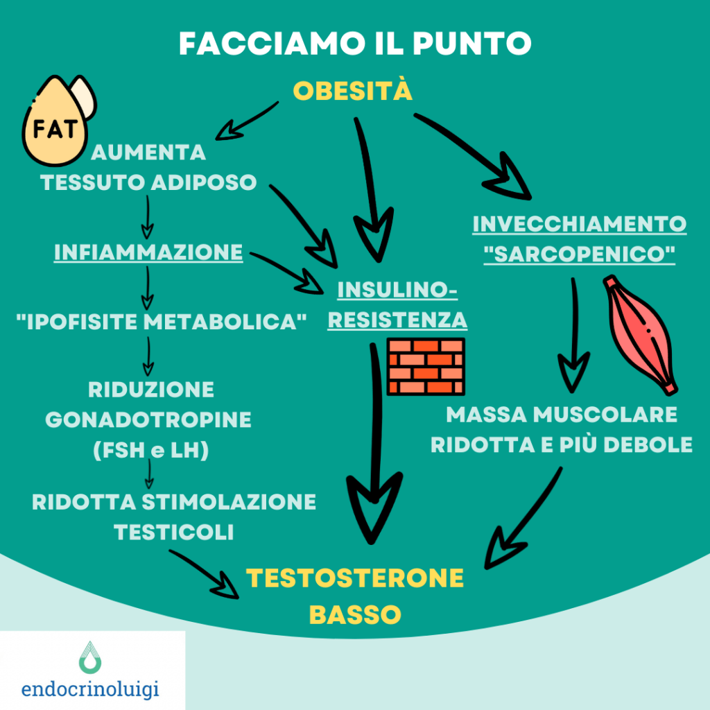 Nell’obeso i fattori responsabili della riduzione del testosterone sono stati prevalentemente collegati all’aumentata produzione di molecole infiammatorie da parte del tessuto adiposo, espressione di uno stato infiammatorio cronico di basso grado, in grado di determinare una infiammazione dell’ipofisi (“ipofisite metabolica”), che comporta una riduzione della produzione degli ormoni che stimolano il testicolo a produrre testosterone (gonadotropine).
