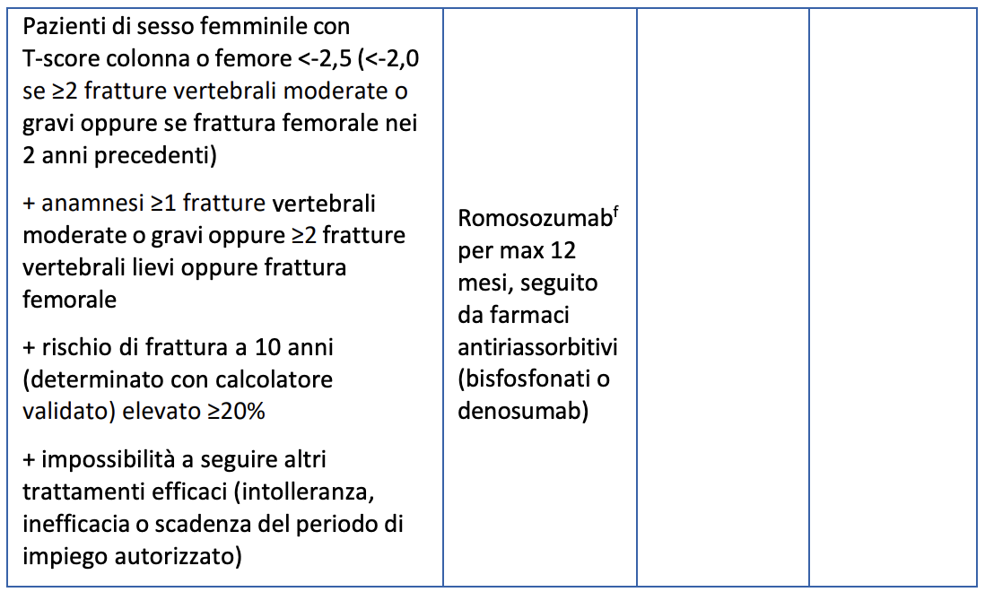 L’analisi della letteratura disponibile autorizza al momento la prescrizione di romosozumab esclusivamente a pazienti di sesso femminile che presentino le seguenti caratteristiche:
