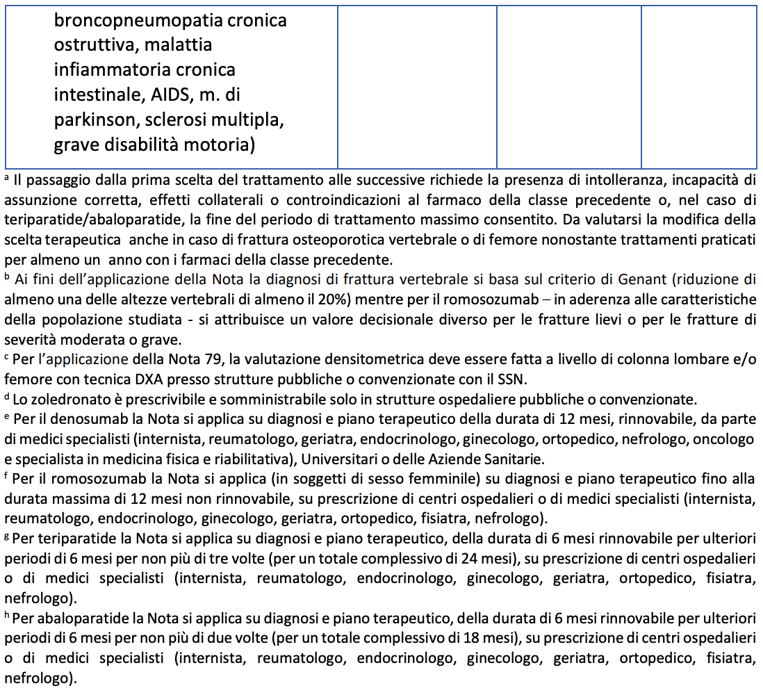 Il 29 agosto 2022 è stata aggiornata la Nota 79, tramite cui il Servizio Sanitario Nazionale regola il trattamento per l’osteoporosi e la rimborsabilità dei farmaci utilizzabili, suddividendoli in prima, seconda o terza scelta, a seconda delle condizioni cliniche del paziente. L’esigenza di questa modifica nasce sostanziamente dalla volontà di introdurre in nota un nuovo farmaco per combattere l’osteoporosi, il Rososozumab.
