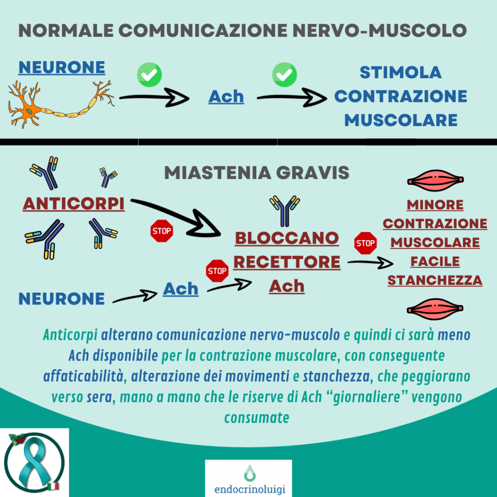 Nei pazienti con MG la tiroidite di Hashimoto è più frequente. Inoltre l’ipotiroidismo non trattato può peggiorare i sintomi della miastenia, come la stanchezza e l’affaticabilità muscolare; a volte mascherando la diagnosi.