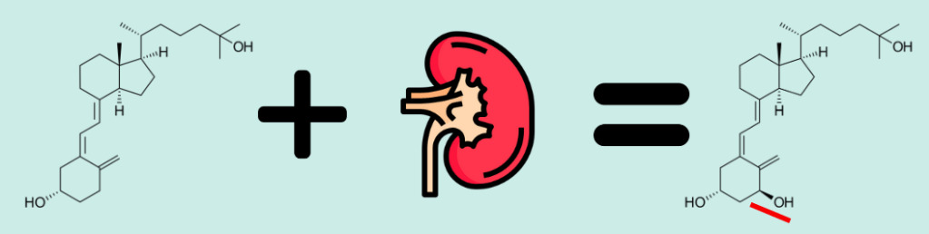 La 25OH-vit D3 nel rene, grazie all’enzima 1-alfa-idrossilasi, viene trasformata in 1,25OH2-vit D3 (detta anche calcitriolo), che è la forma più attiva, in grado di favorire l’assorbimento di calcio e fosforo dall’intestino e far depositare il calcio nelle ossa per renderle più forti.