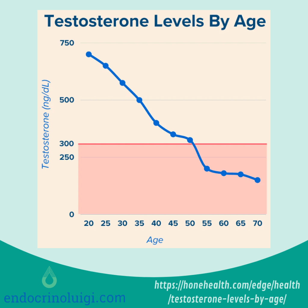 Nell’invecchiamento fisiologico, generalmente il calo di testosterone è molto graduale (diminuisce dell’1-2% all’anno e risulta pressoché dimezzata intorno ai 70/80 anni), e può anche non avere sintomi evidenti o manifestarsi solo dopo i 60/70 anni. Tuttavia, alcune patologie (obesità, diabete mellito, ipercolesterolemia, ipertensione, patologie cardiovascolari, insufficienza renale cronica, sindrome delle apnee ostruttive del sonno, depressione) contribuiscono a una caduta più rapida del testosterone (anche a partire dai 40 anni) associata a dei sintomi specifici, causando una vera condizione patologica volgarmente nota come andropausa (adult- and late-onset hypogonadism).