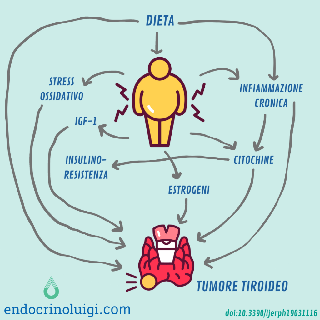- L’obesità è associata a uno stato di infiammazione cronica di basso grado caratterizzato dall’attivazione aspecifica del sistema immunitario, un aumento dei fattori infiammatori e produzione di varie citochine e adipochine. Questi elementi possono direttamente o indirettamente determinare la proliferazione cellulare e promuovere lo sviluppo tumorale in vari tessuti, incluso il ghiandola tiroidea.