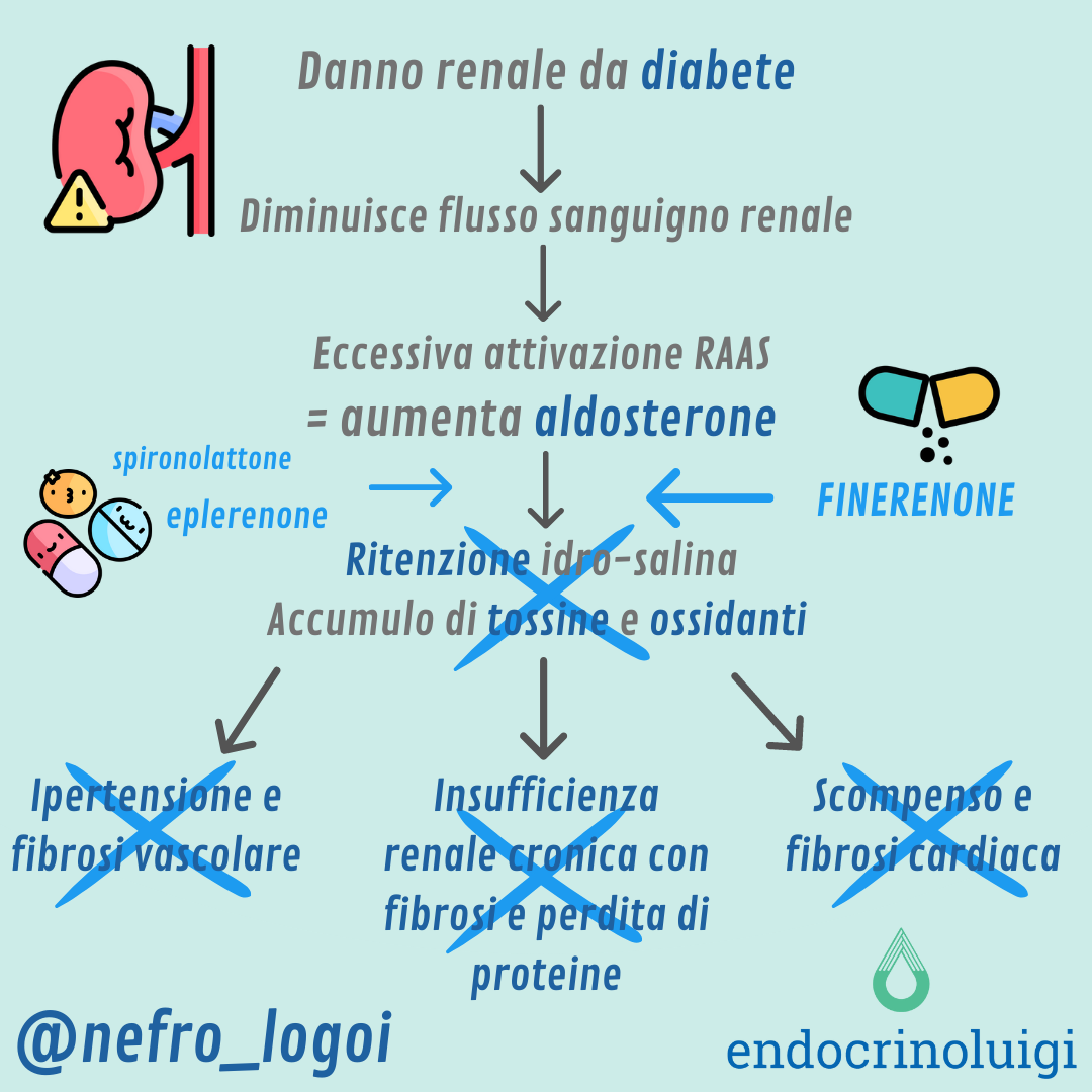 L’aldosterone, un ormone prodotto dalle ghiandole surrenali, gioca un ruolo nell’aumentare il rischio cardiovascolare e la progressione della malattia renale. L’aldosterone in condizioni patologiche favorisce la ritenzione di sodio e la perdita di potassio e magnesio, promuove l’infiammazione e la fibrosi cardiaca e renale.