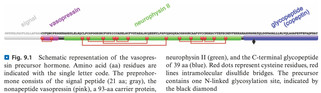 L’arginin-vasopressina (AVP) o ormone anti-diuretico (ADH) è il principale determinante del riassorbimento di acqua libera da parte del rene. È un peptide di nove aminoacidi, sintetizzato come pro-ormone dai nuclei sopraottico e paraventricolare dell’ipotalamo. Pro-AVP entra all’interno di granuli neurosecretori e viene trasportato lungo il peduncolo ipofisario nella neuroipofisi, dove i granuli vengono accumulati nel citoplasma. Durante il trasporto, il pro-ormone viene trasformato nel nonapeptide AVP, nella proteina trasportatrice neurofisina II (NPII), e in un glicopeptide C-terminale chiamato copeptina.