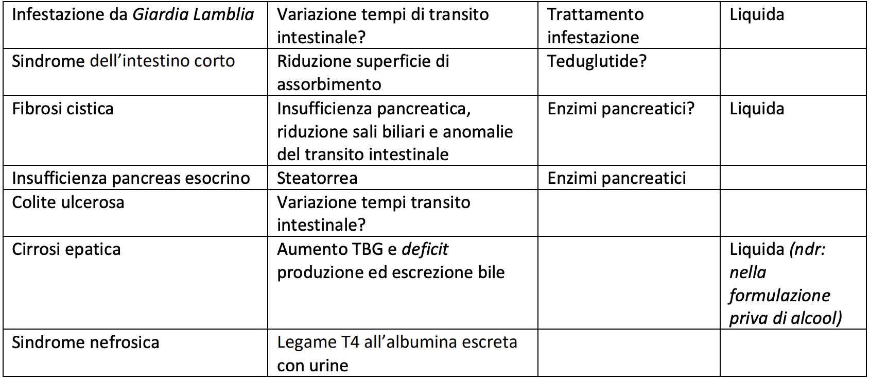 Anche dopo un’attenta considerazione di tutti questi fattori, la discriminazione tra una causa non ancora identificata di vero malassorbimento della tiroxina e una scarsa aderenza del paziente alla terapia può rivelarsi difficile. In queste circostanze, un test di assorbimento della tiroxina (poco utilizzato in Italia) può aiutare a risolvere il problema. Assicurarsi che il paziente sia a digiuno dalla mezzanotte e somministrare l’equivalente di 1,6 × peso corporeo (kg) × 7 microgrammi in formulazione liquida (preferibile) o compresse arrotondata ai 50 microgrammi più vicini, seguiti immediatamente da 200 ml di acqua per os. I campioni di sangue per la misurazione di FT4, FT3 e TSH devono essere raccolti a 0, 30, 45, 60, 90, 120, 240 e 360 minuti. un incremento di FT4 dopo 3 ore > 5.15 pmol/L (> 0.40 ng/dL) aveva una sensibilità del 97% e una specificità dell’80% nell’escludere un vero malassorbimento. Continuare la somministrazione supervisionata di questa singola dose settimanale per 6 settimane. La normalizzazione del TSH conferma la scarsa aderenza del paziente alla terapia e il dosaggio settimanale può essere mantenuto. L’aumento inadeguato di FT4 suggerisce malassorbimento. Nessun cambiamento nella TSH richiede ulteriori indagini sui disturbi del metabolismo degli ormoni tiroidei.