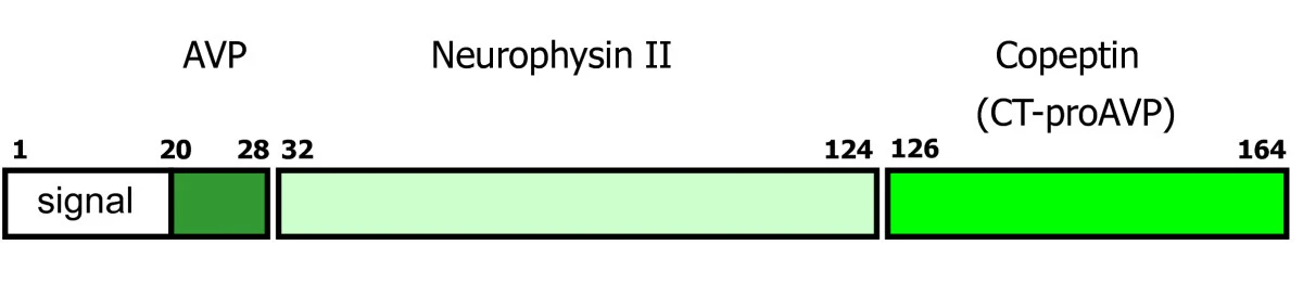 La copeptina costituisce la porzione C-terminale di 164 amminoacidi della pre-provasopressina e sembra avere una funzione importante nel ripiegamento della vasopressina. In seguito a stimolazione (es. aumento dell’osmolarità plasmatica e riduzione del volume ematico) la vasopressina e la copeptina sono rilasciate dai granuli secretori dell’ipofisi in cui si trovano immagazzinate ed entrano rapidamente in circolo nel torrente sanguigno in quantità equimolari (rapporto 1:1).