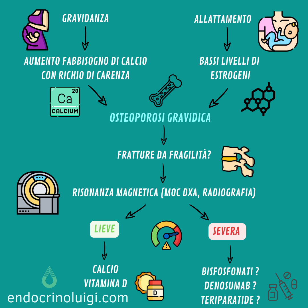 Per quanto riguarda i farmaci, i bisfosfonati sono efficaci, ma ci sono alcune preoccupazioni sul fatto che accumulandosi nelle ossa possano essere esposti al feto nelle gravidanze successive e avere effetti negativi sullo scheletro fetale. Anche la durata ottimale dei bifosfonati nell’osteoporosi correlata alla gravidanza rimane irrisolta. Tuttavia, il trattamento fino a 5 anni sembra un approccio ragionevole.