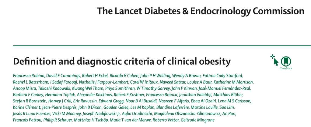 - Rubino F, Cummings DE, Eckel RH, Cohen RV, Wilding JPH, Brown WA, Stanford FC, Batterham RL, Farooqi IS, Farpour-Lambert NJ, le Roux CW, Sattar N, Baur LA, Morrison KM, Misra A, Kadowaki T, Tham KW, Sumithran P, Garvey WT, Kirwan JP, Fernández-Real JM, Corkey BE, Toplak H, Kokkinos A, Kushner RF, Branca F, Valabhji J, Blüher M, Bornstein SR, Grill HJ, Ravussin E, Gregg E, Al Busaidi NB, Alfaris NF, Al Ozairi E, Carlsson LMS, Clément K, Després JP, Dixon JB, Galea G, Kaplan LM, Laferrère B, Laville M, Lim S, Luna Fuentes JR, Mooney VM, Nadglowski J Jr, Urudinachi A, Olszanecka-Glinianowicz M, Pan A, Pattou F, Schauer PR, Tschöp MH, van der Merwe MT, Vettor R, Mingrone G. Definition and diagnostic criteria of clinical obesity. Lancet Diabetes Endocrinol. 2025 Jan 9:S2213-8587(24)00316-4. doi: 10.1016/S2213-8587(24)00316-4. Epub ahead of print. PMID: 39824205.