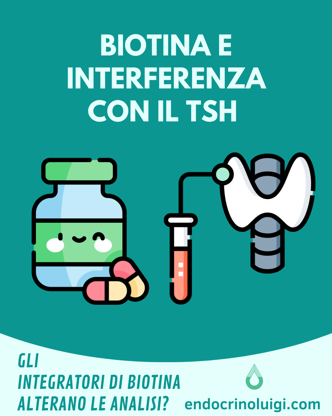 Tradotto: se misuriamo il TSH in pazienti con normale funzionalità tiroidea ma che assumono biotina, questo può risultare più basso del normale simulando un quadro di IPERtirodismo, in genere reversibile dopo almeno due giorni di sospensione della biotina stessa.