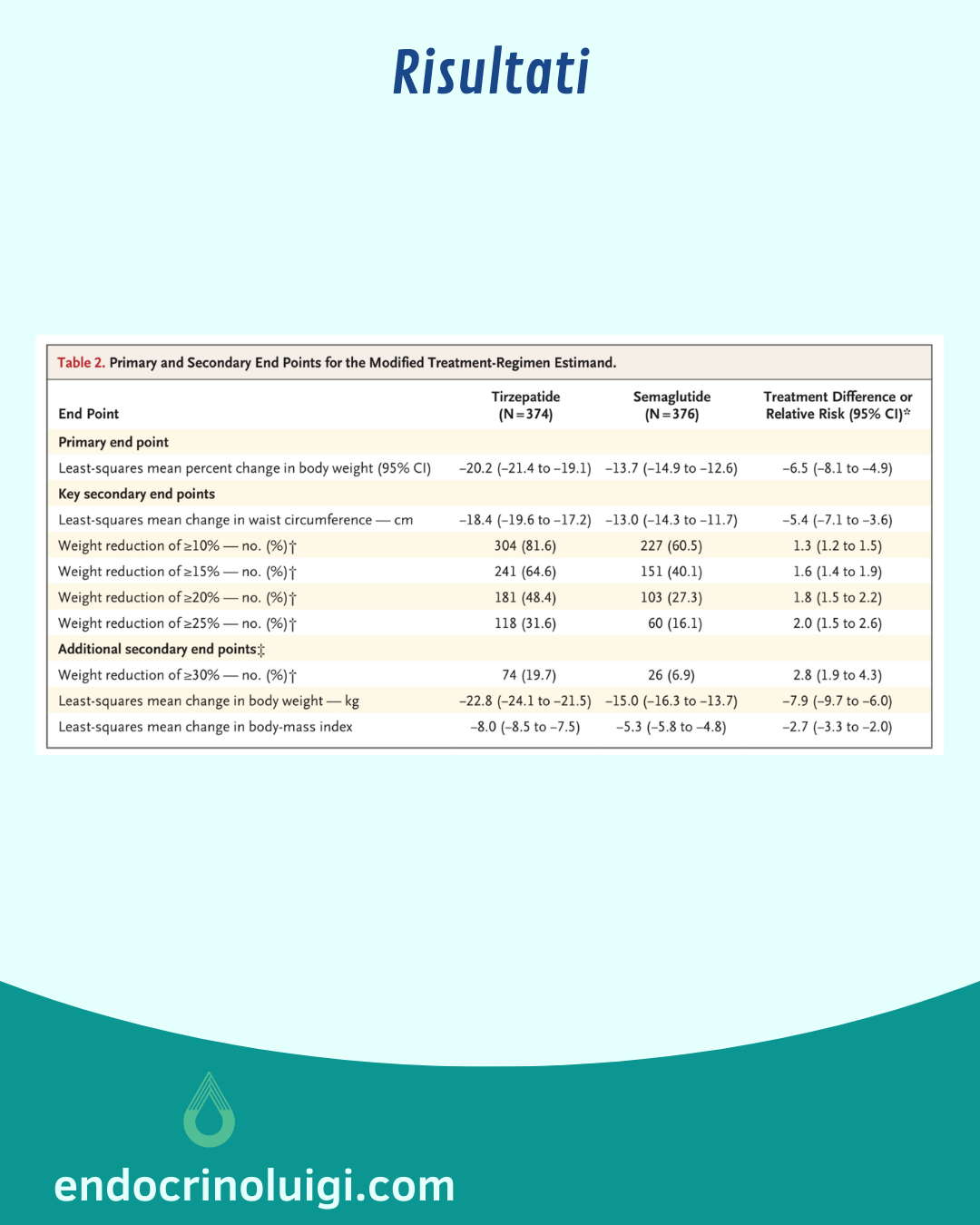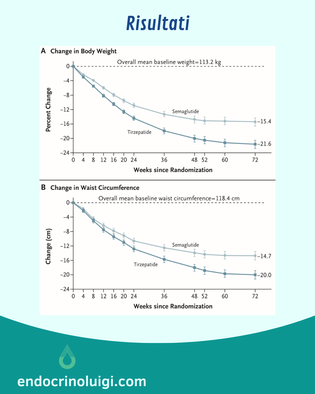 La variazione media della circonferenza vita è stata di −18,4 cm (CI 95%, da −19,6 a −17,2) con tirzepatide e di −13,0 cm (CI 95%, da −14,3 a −11,7) con semaglutide (P<0,001).