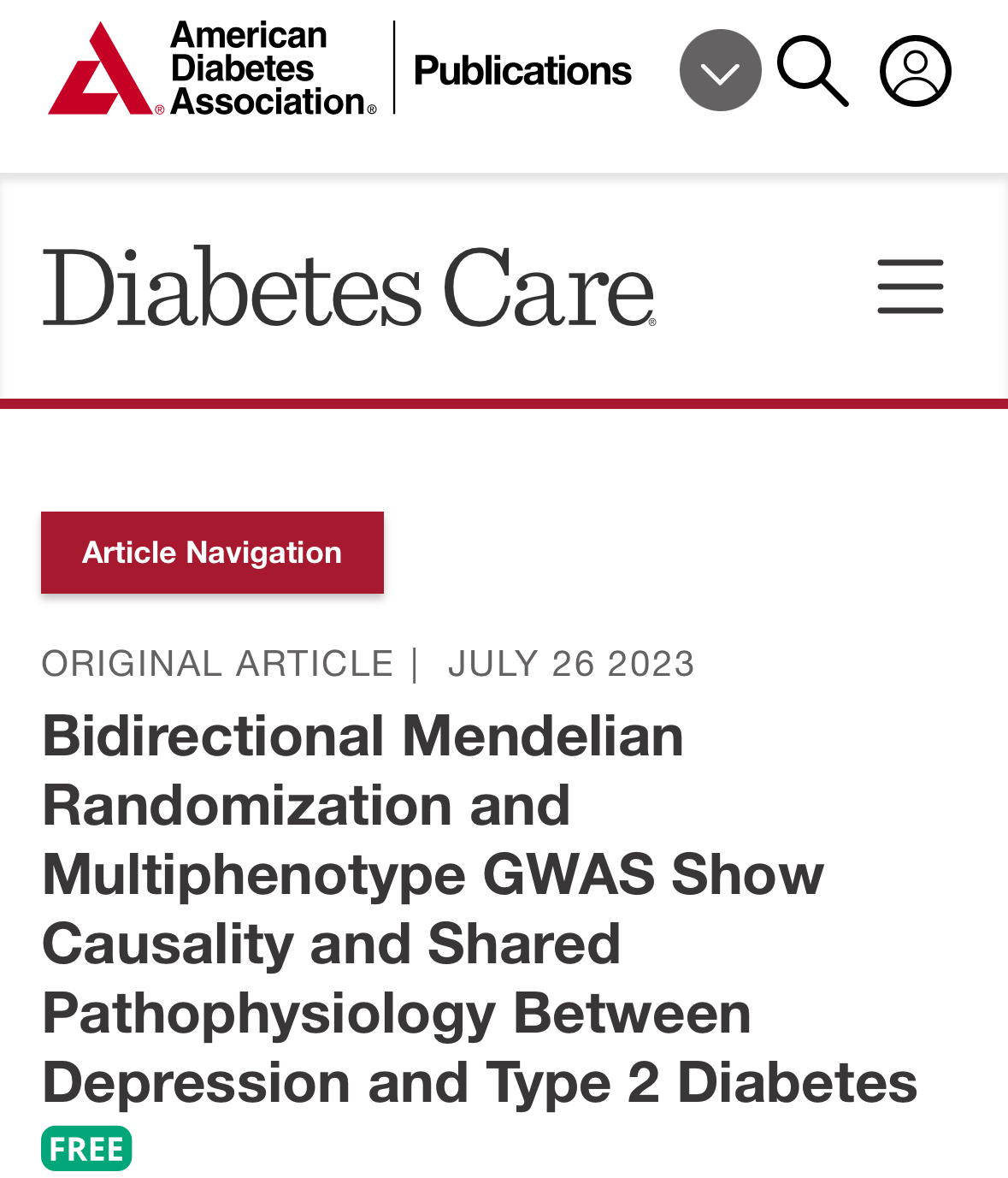 - Jared G. Maina, Zhanna Balkhiyarova, Arie Nouwen, Igor Pupko, Anna Ulrich, Mathilde Boissel, Amélie Bonnefond, Philippe Froguel, Amna Khamis, Inga Prokopenko, Marika Kaakinen; Bidirectional Mendelian Randomization and Multiphenotype GWAS Show Causality and Shared Pathophysiology Between Depression and Type 2 Diabetes. Diabetes Care 1 September 2023; 46 (9): 1707–1714. https://doi.org/10.2337/dc22-2373