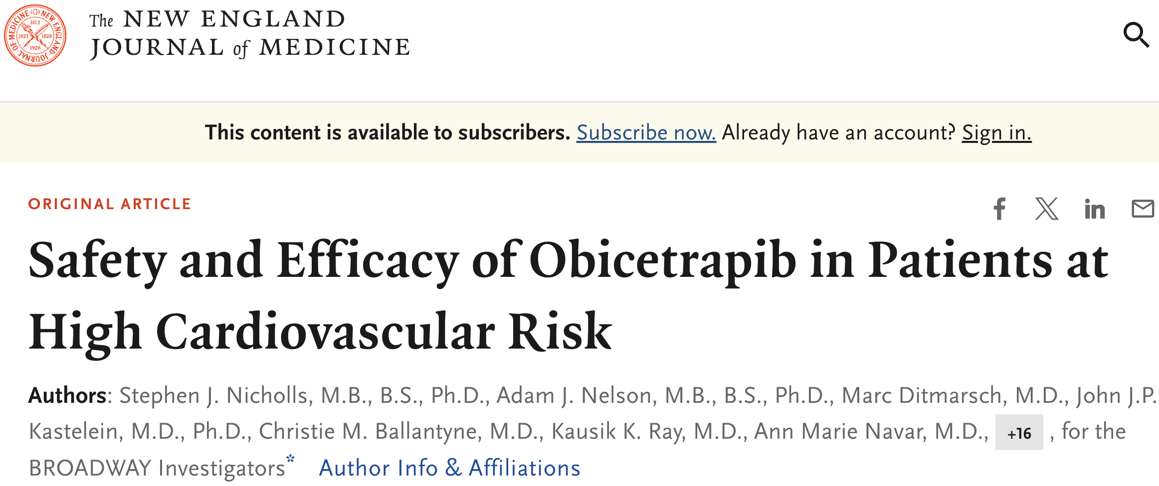 - Nicholls, Stephen J et al. “Safety and Efficacy of Obicetrapib in Patients at High Cardiovascular Risk.” The New England journal of medicine vol. 393,1 (2025): 51-61. doi:10.1056/NEJMoa2415820